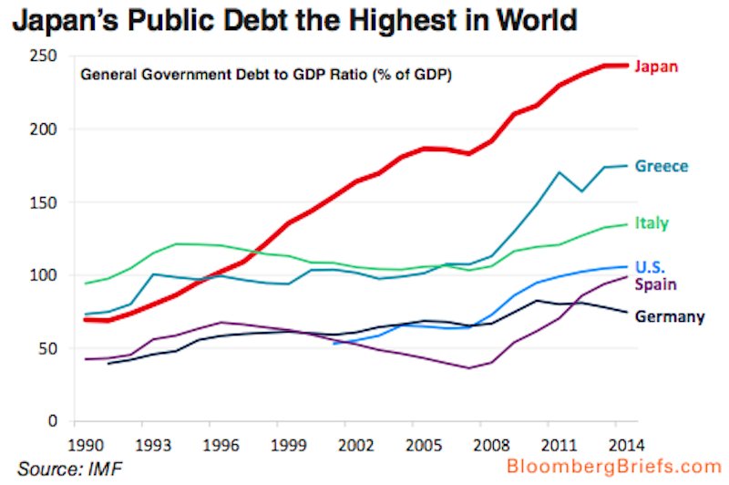 Doch verglichen mit Japan ist Griechenland noch ein Musterknabe. Japans Staatsschulden betrugen schon 2014 rund stolze 250% des BIP, Tendenz steigend!