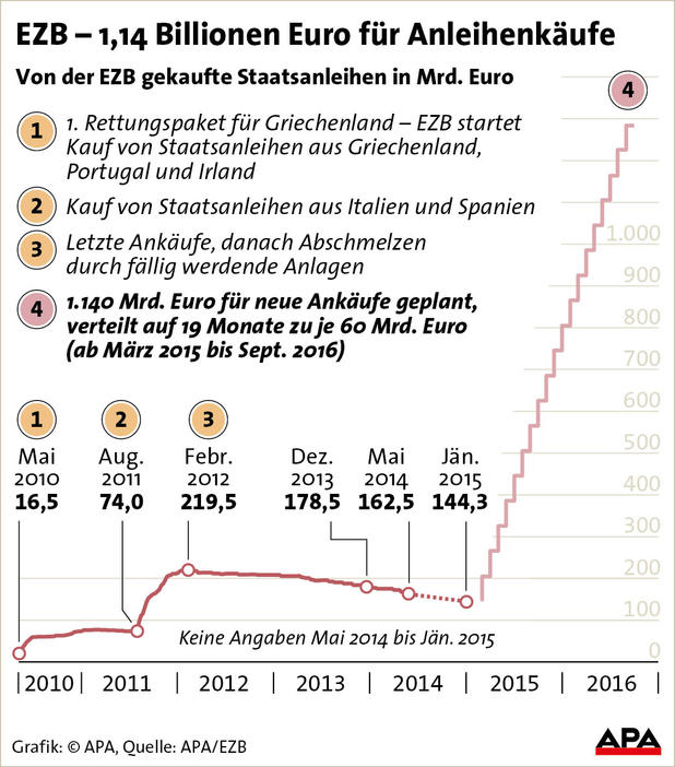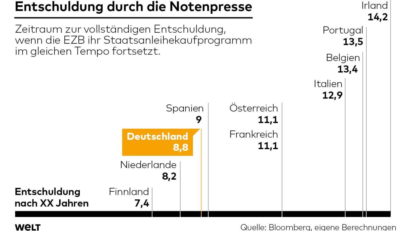 Wenn die Aufkäufe von Staatsanleihen durch die EZB im gleichen Tempo weitergehen, wäre Deutschland schon in rund neun Jahren effektiv schuldenfrei und auch Griechenland wäre spätestens dann soweit faktisch entschuldet, dass die Restschulden kein Bonitätsproblem mehr darstellen würden.